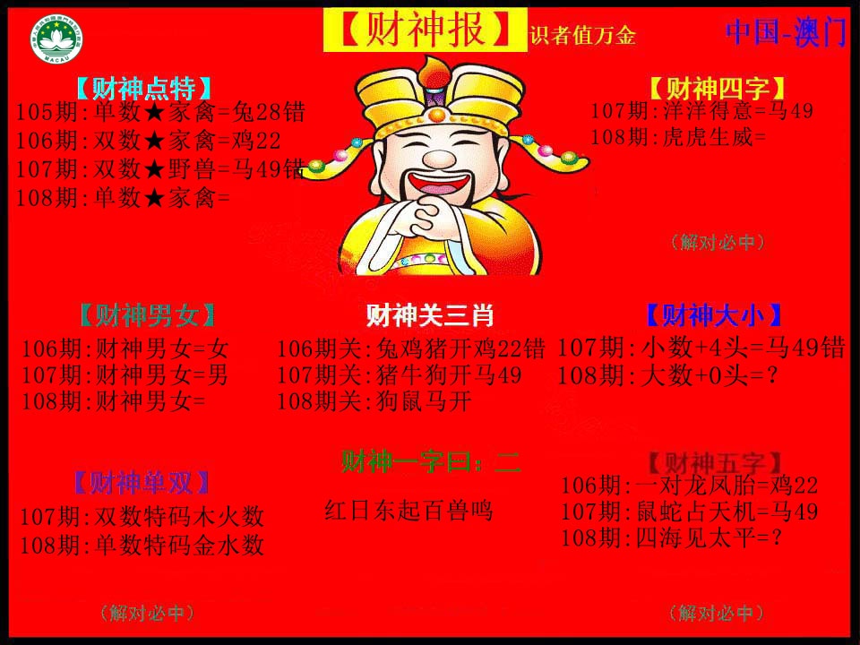 108期: 澳门六合皇彩圖信封【黄财神报】每期自动更新